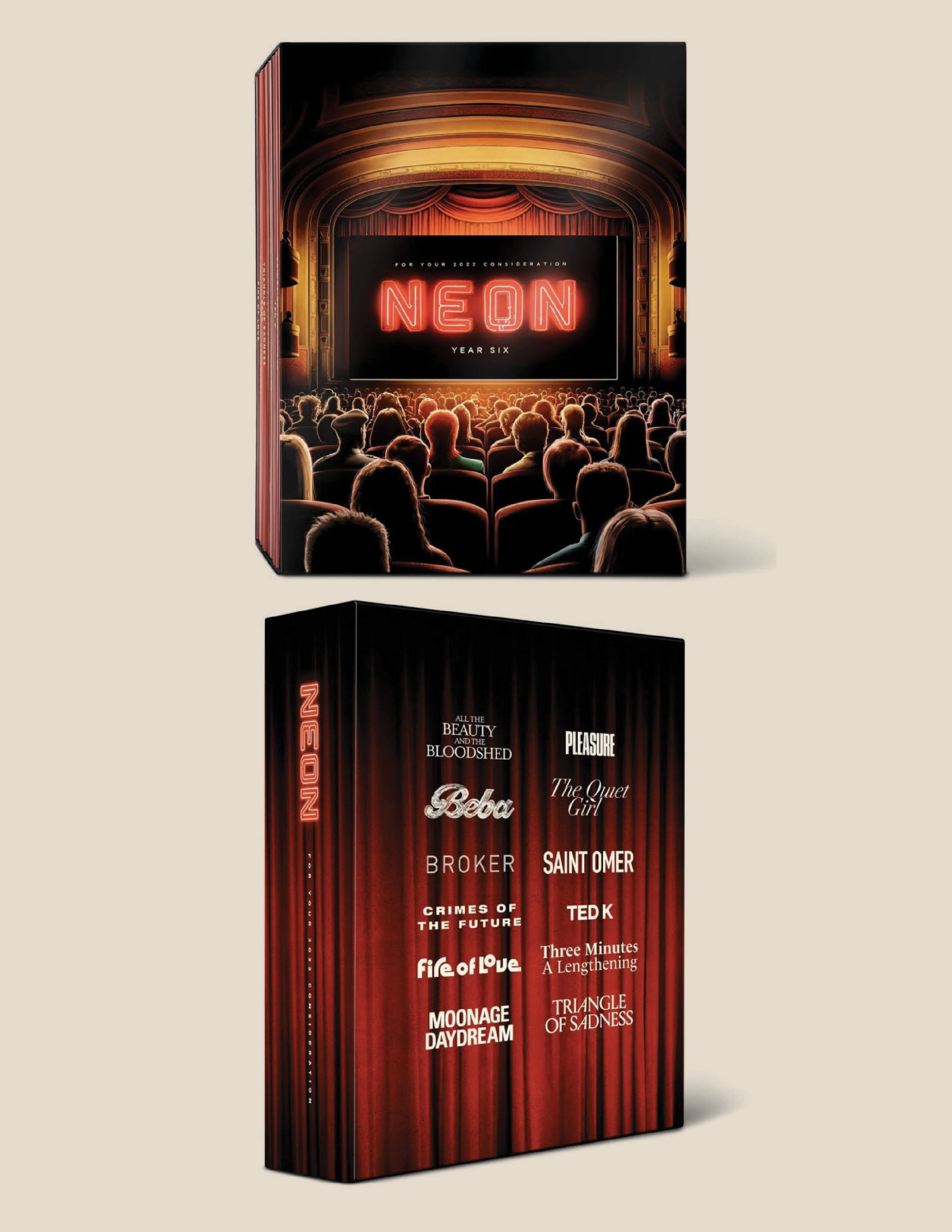 Since 2017, the most highly anticipated promotional item among film critics has been the Neon box set, a gorgeous annual package containing all the indie distributor’s releases on individual DVDs. In an era when impersonal screener links are ubiquitous, the Neon box feels artisanal, exclusive, classy and tangible. This year-end package includes Ted K, Triangle of Sadness, Moonage Daydream, and nine other releases from Neon’s 2022 calendar.